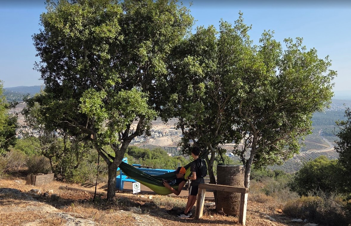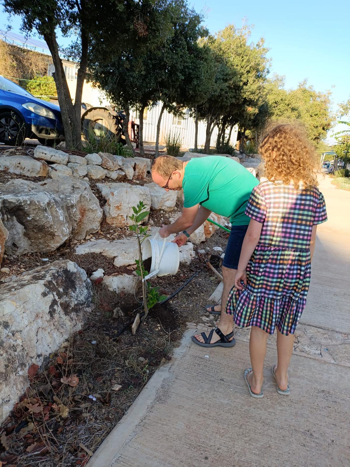 פרויקט "אמץ עץ" ביישוב פלך. משפחה מאמצת עץ ציבורי ודואגת לו כאילו היה בן משפחה.